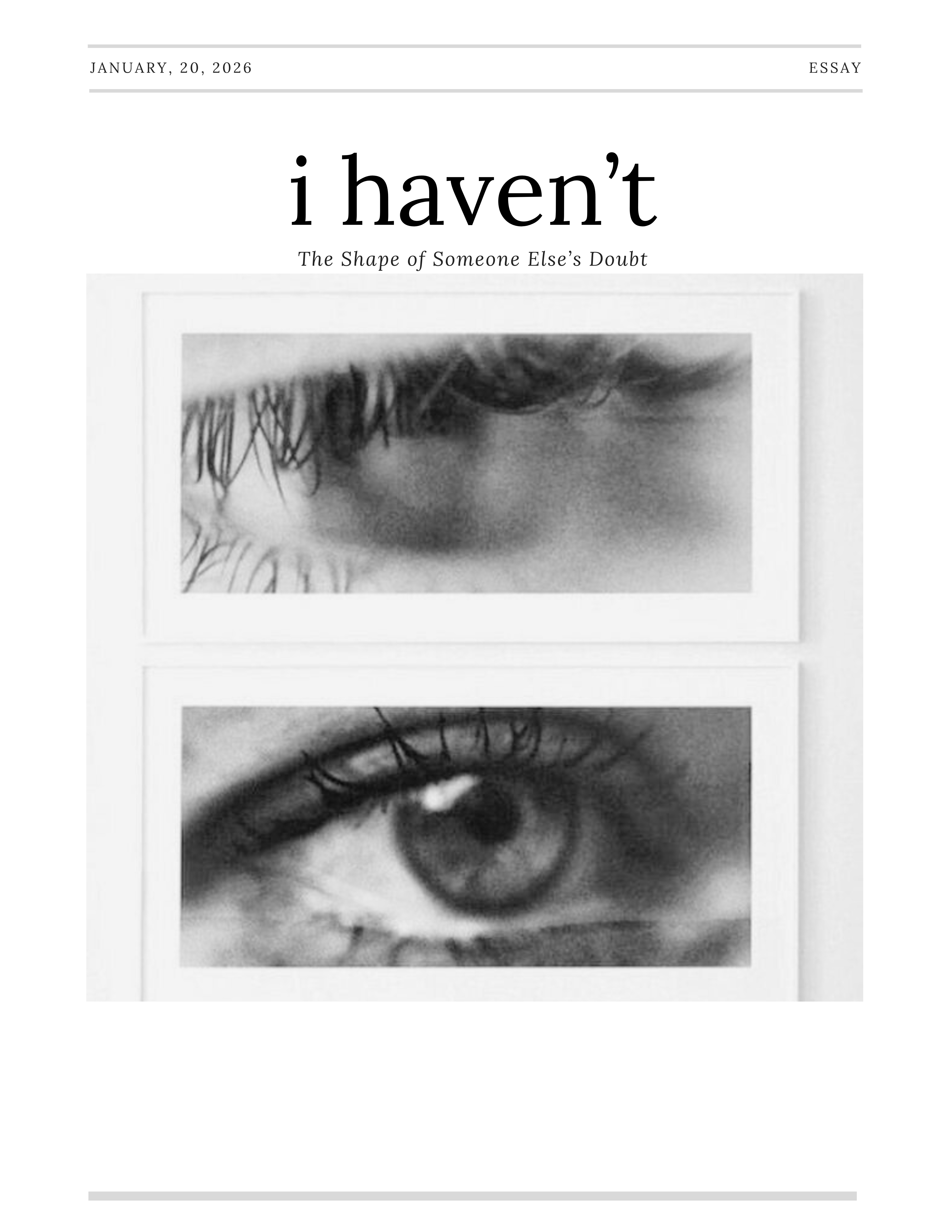 A reflection on the weight of words that stay.“I haven’t” becomes more than a statement—it becomes a boundary, a projection, a passing down of doubt. This piece explores how limitation can be inherited, and how identity is shaped in the space between what is said and what is chosen to be believed.Not loud. Not confrontational. Just steady resistance.